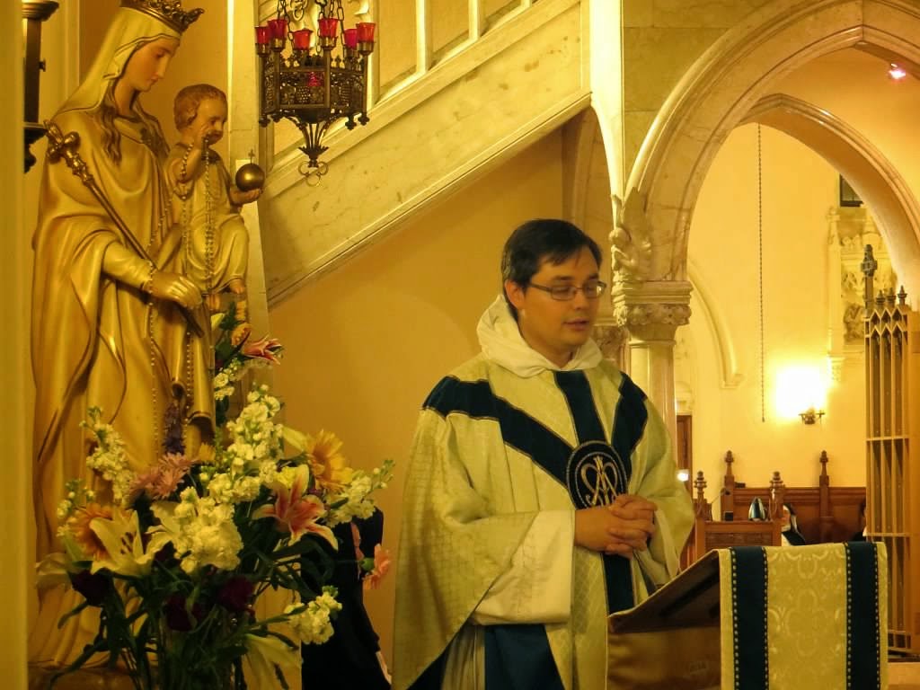 Corpus Christi MonasteryThe Dominican Nuns of Corpus Christi Monastery in Menlo Park, California, hosted a day of study and prayer on the Dominican charisma as part of their observance of the year of consecrated life. These photos show the Dominican Rite Solemn Mass that was celebrated as part of this event. The celebrant of this Mass was Fr. Ambrose Signman, O.P., assistant pastor of St. Raymond of Pennyfort Church, Menlo Park CA, the deacon was Fr. Christopher Fedok, O.P., pastor of St. Raymond's, the subdeacon was Fr. Robert Verril, O.P., of the Province of England, a student at the Dominican School of Philosophy and Theology, Berkeley CA. The novices of the Western Dominican Province were present and three served the Mass as acolytes and thurifer. There was no crucifer as the Mass was a the Mass of Our Lady on Saturday, which is Fourth Class Votive Mass celebrated with the ceremonies of a Second Class of Our Lady (i.e., with a Gloria and Credo). Mass was sung in Dominican Gregorian chant by the nuns of the monastery.The monastery is a house of Perpetual Adoration, and the throne for the monstrance can be seen above the grill opening. Normally during Mass, as there has never been a tabernacle on the altar, the Blessed Sacrament is moved temporarily to an ambry on the Epistle side of the altar. It can be seen behind the ministers' chairs. As at this Mass use of the ambry would have put the the minister's backs to the Sacrament, it was moved to a chapel inside the monastery. Thus the movements and positions of the ministers are those used when Mass is celebrated on an altar where the sacrament is not reserved, e.g. the Dominus vobiscum and collect are sung at the missal, not in the center of the altar.