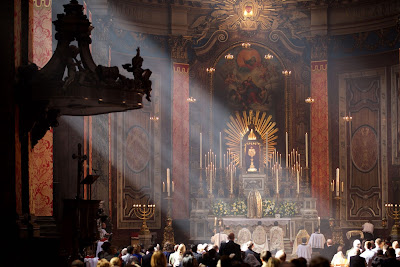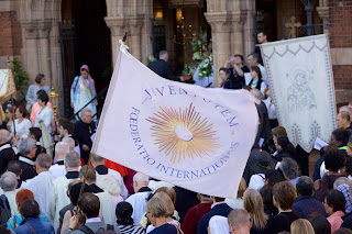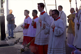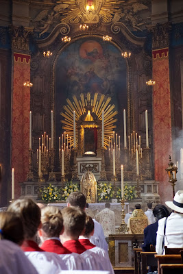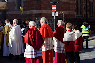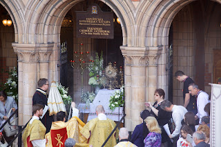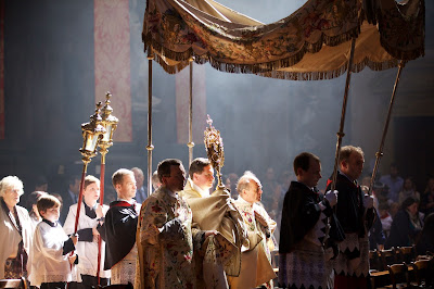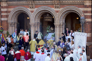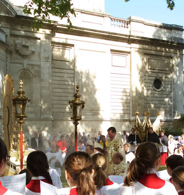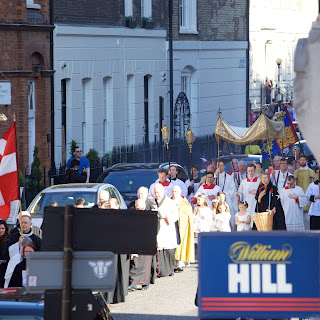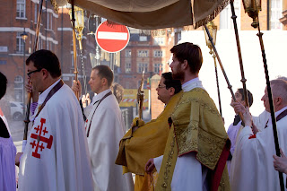 This afternoon there were two Corpus Christi Processions in central London. The first took place at the London Oratory with Solemn Benediction at the Stational Altar in the courtyard beside the church and then afterwards inside the church itself. The children of the London Oratory Junior Choir sang with the Oratory Senior Choir, and the Brothers of The Little Oratory were assisted by the servers of St Philip's School.