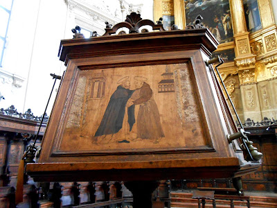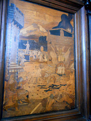 In addition to numerous other decorative details, every seat of the choir has above it an inlaid wooden panel with a Biblical scene. These were executed in only 8 years, 1541-49, by Fra Damian of Bergamo, who also did the lectern shown below.