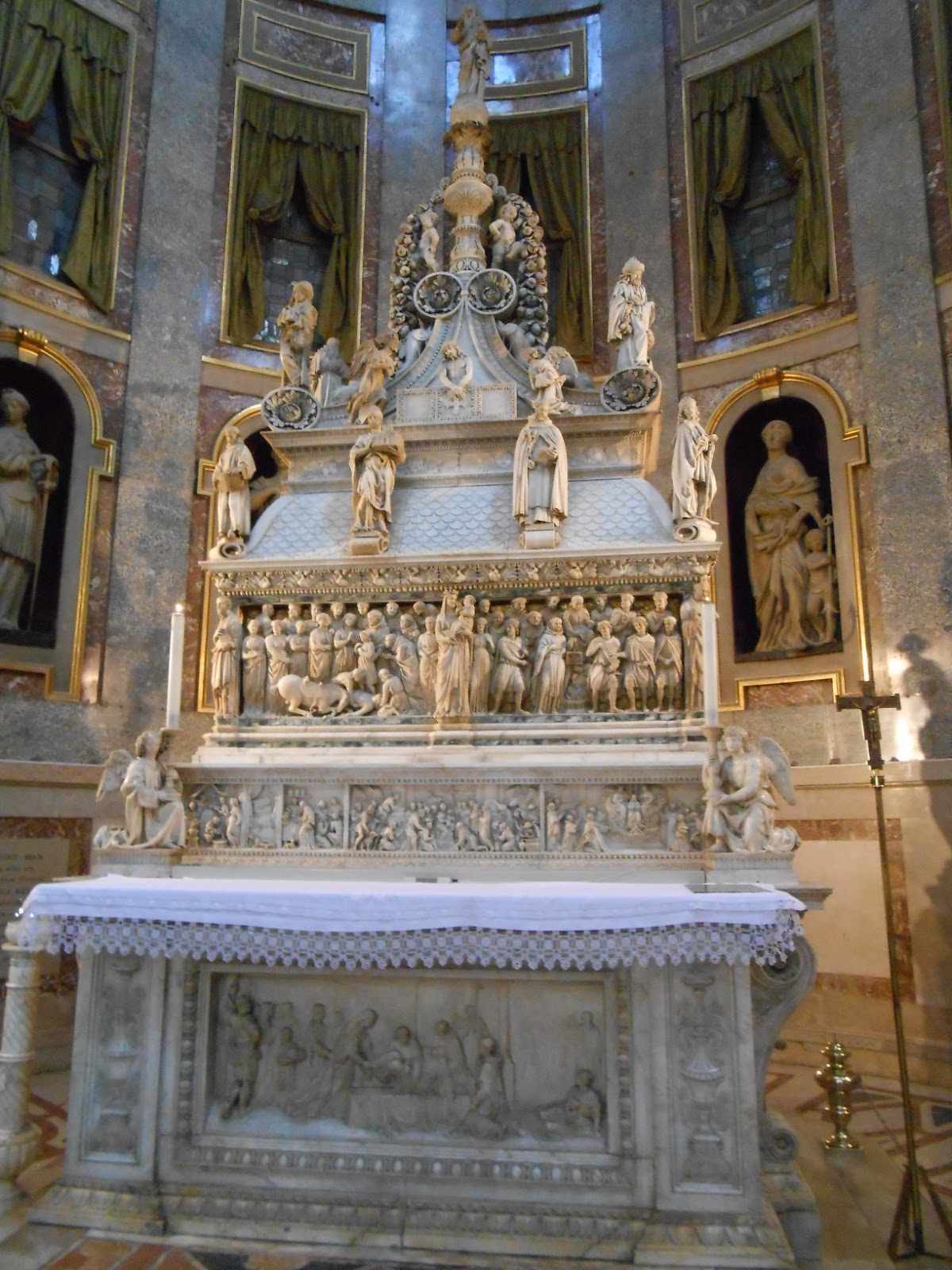 The choir stalls were formerly in the nave of the church in front of the principal altar, and further separated from the main nave by a choir screen. The latter was removed after the Council of Trent, the choir then disassembled and rebuilt in a vastly expanded apse behind the main altar.