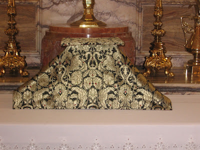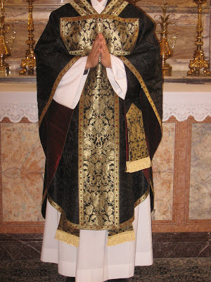 For the feast of St Charles Borromeo, here are some pictures of a new “Borromeo-style” black vestment, made by Br. Augustine, O.F.M. Conv., from the National Shrine of St Maximilian Kolbe in Libertyville, Illinois, (a.k.a. Marytown), with our thanks to him for sharing this with our readers. In a different way from the vestment we noted two days ago, this strikes a good and appropriate balance between the somber and the hopeful, with gold decorative elements that might easily go on a red or white vestments, but laid over the basic black.