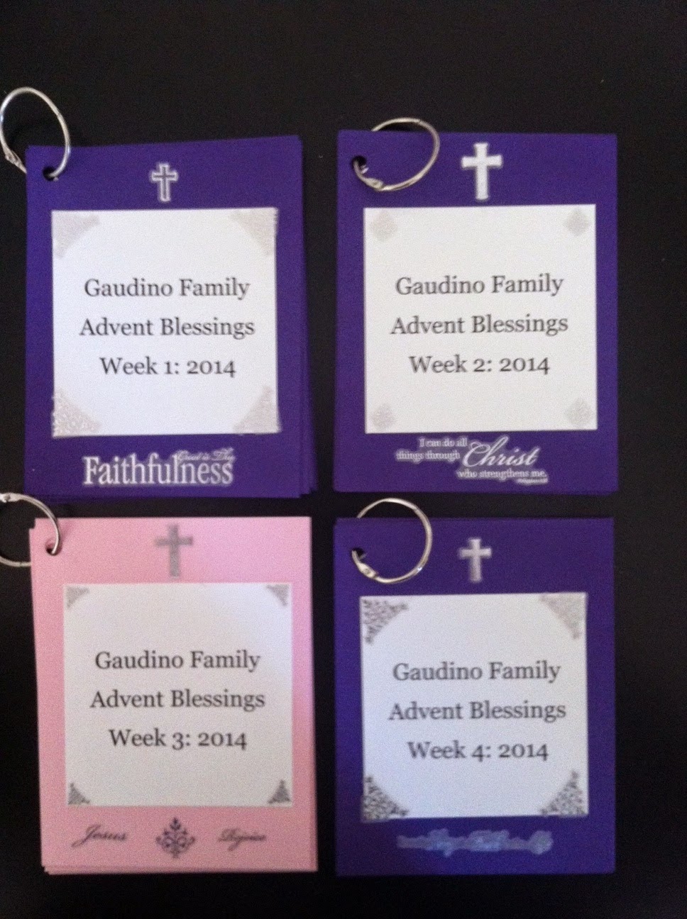 3. Family Blessings JournalI found the idea for a Family Blessings Journal in this book :Advent in the Home: Activities for Families. Using cardstock and some decorative stickers, I made a book for each week of Advent. For each day, every member of the family will share and write down the individual blessing we are most grateful for. I am looking forward to learning more about my husband and children and growing together as a family in gratitude towards the Lord. My prayer is that these journals will become a yearly tradition and a treasured keepsake that we can look back on each year. Here are some pictures of our newly minted Family Blessings Journals:4. Advent Daily Read-AloudJessica at Shower of Roses inspired me several years ago with her gorgeous Advent book basket -I imagined the joy my children would experience seeing a big basket of beautifully wrapped purple and pink books. The book basket did not disappoint and when my daughter saw this year's books all wrapped and ready to go - she jumped up and down and said "Mommy I can't wait for Advent!" The book basket consists of Advent and Christmas stories - both faith-based and secular. We unwrap the book of the day, snuggle on the couch and read it together every morning. Each year we add new books and weed out the ones that the kids have outgrown. Here's a picture of this year's book basket:
