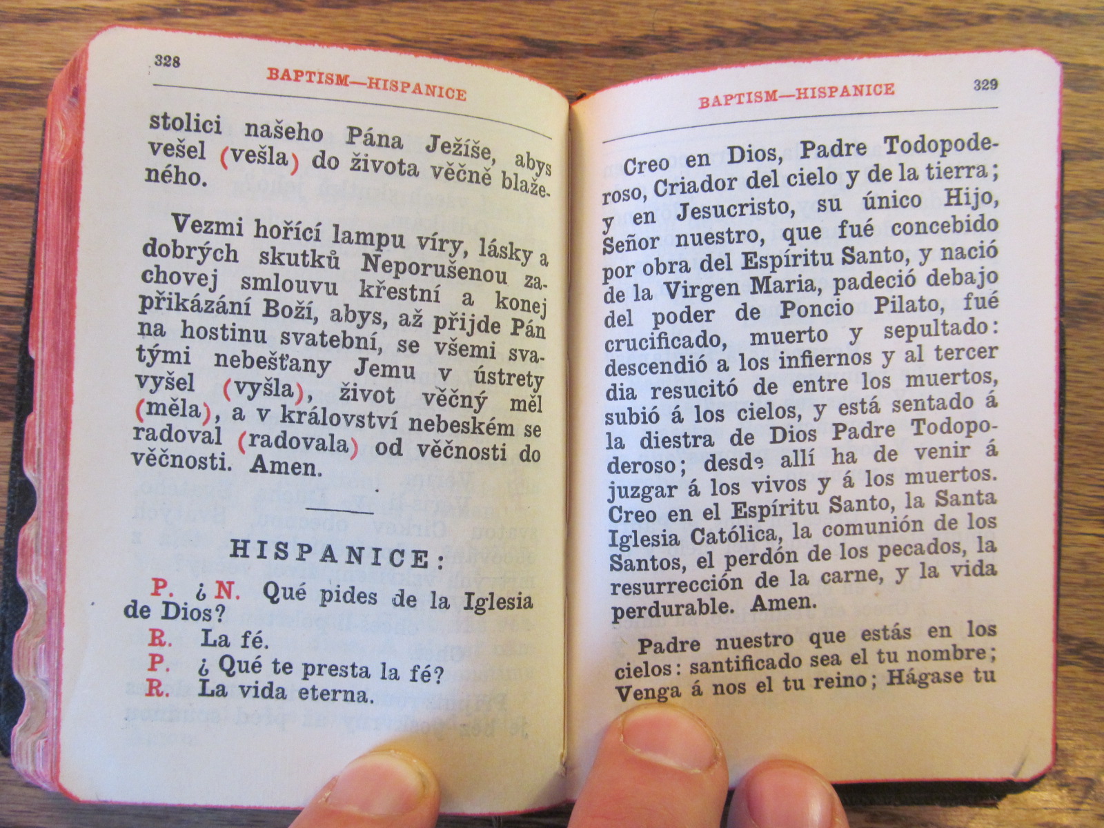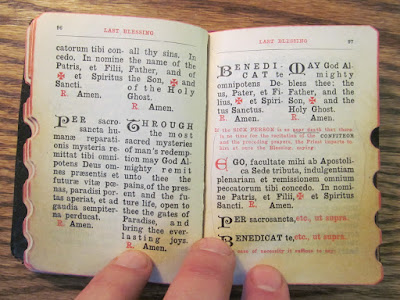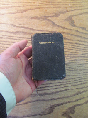 The Priest's New Ritual for the Convenience of the Reverend Clergy in the Administration of the Sacraments and Various Blessings. Compiled by the Rev. Paul Griffith. Baltimore: John Murphy, 1927, repr. 1941. 340 pp. This book, also very rare, is TINY (see photos) and yet has a lengthy appendix containing short rites of baptism and matrimony in French, German, Italian, Polish, Lithuanian, Bohemian, and Spanish (pp. 310-40). Alas, a former clerical owner has struck through with pencil all the exorcisms in the rite of baptism, probably in response to some confusing instruction in the 1960s, but it looks like these could be erased carefully. The binding is failing but the book still holds together. $40 or best + s/h.