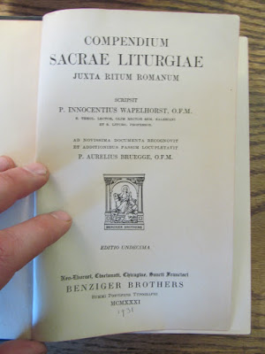 To purchase any of these or to ask me a question, please use my NLM address (pkwasniewski@newliturgicalmovement.org).Wapelhorst, Innocentius, O.F.M. Compendium Sacrae Liturgiae, Juxta Ritum Romanum. New York: Benziger Brothers, 1931. xii + Signed by a seminarian, 1938. [One thing I find very interesting are the three notes penciled into the front title page, in the early 40s: "Rubrics growing too formalistic: two blocks up, two over, straight ahead. They were cut down after Trent. About time for another shearing. Till then we are strictly held." And: "Every young priest ought to give himself five years training in these matters. 1940 - 41 - 42 - 43 - 44 - 45." And: "Three 'Bone' Rules of Liturgy. Know what to do. Understand what you do. Mean what you do." Pencil notes of the same author neatly found on a number of pages. Cover not in the best condition but the binding is still secure. $50 or best offer + s/h.Mueller, John Baptist. Handbook of Ceremonies for Priests and Seminarians. 14th English ed. St. Louis: B. Herder, 1950. xiv + 460. Excellent condition. Fold-out in the back. $20 or best offer + s/h.