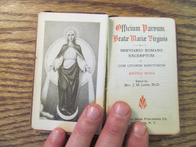 Officium Parvum Beatae Mariae Virginis, Breviario Romano Excerptum, cum Litaniis Sanctorum. Ed. Rev. J. M. Lelen. New York: Catholic Book Publishing Co., 1944. A compact edition of the Little Office of the BVM, entirely in Latin, with the long (traditional) Litany of Saints in the back, together with the brief sacramental formulas. Text inside in good shape; cover worn; somewhat fragile condition. $15 + s/h.