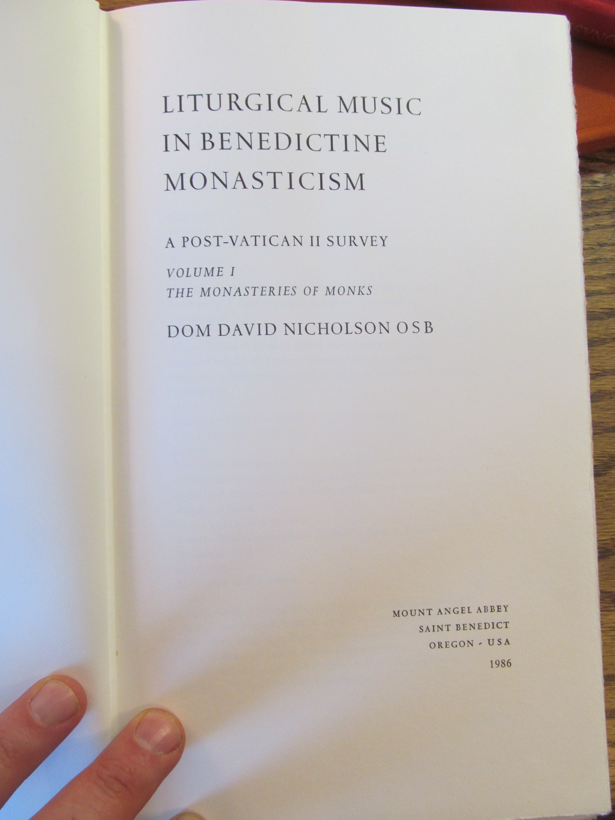 Nicholson, Dom David, O.S.B. Liturgical Music in Benedictine Monasticism: A Post-Vatican II Survey. 3 hardcover volumes (the third being Liturgical Music in Cistercian Monasticism). St. Benedict, OR: Mount Angel Abbey, 1986. x + 188; ix + 170; x + 142. A beautiful and rare set that brings together research on the way in which hundreds of monasteries responded to the Council and the liturgical reform, as regards the manner of celebrating the Mass, the language, the music, the retention of Gregorian chant, etc. A crucial research tool for someone working on the decline and revival of monasticism in the past 50 years. The first vol. has marbled endpapers. $120 for the set, or best offer, plus s/h.