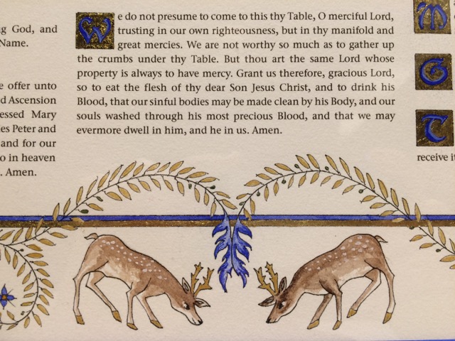 At the base of the central card, seen to be waiting for water to fall from the branches of the Church, are two deer, or hart (Ps. 42:1). These are not only common in the artwork of the liturgical movement, but are also mentioned in Psalm 42 which is recited before the Priest ascends the altar. Thus, at the bottom of the card, they are the first thing to which the Priest will come as he arrives at the altar, to venerate it with a kiss. They also offer a play on words, referring to the motto Blessed John Henry Newman, Cor ad cor loquitur—Heart speaks unto heart—and thus provide a connection with that most famous of Anglican converts, and the secondary patron of the Personal Ordinariate of Our Lady of Walsingham.