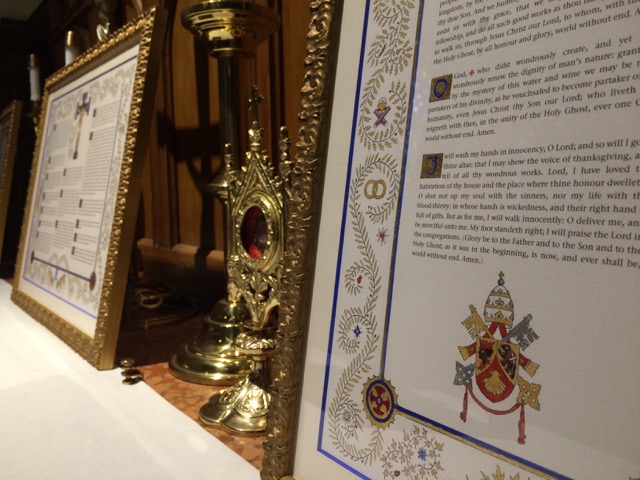Following the promulgation of Divine Worship: The Missal on the First Sunday of Advent 2015, the communities of the personal ordinariates in the United States and Canada, England and Wales, and Australia, have been adjusting to the texts and ceremonies of the new missal, which draws from the tradition of the Book of Common Prayer, and the Anglican missals of the early to mid twentieth century. As the liturgical life of the ordinariates begins now to develop and to flourish, communities and their clergy will no doubt wish to commission works of art to accompany their worship. Examples of this have already been seen with a chalice and paten, commissioned by Saint Gregory the Great in Beverly Farms, MA [http://www.newliturgicalmovement.org/2013/09/photos-of-completed-chalice-and-paten.html].