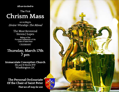 On March 17 at 7 pm, Bishop Steven J. Lopes, the recently ordained first bishop of the Personal Ordinariate of the Chair of St. Peter, will come to Washington, D.C. to celebrate a Chrism Mass, at St. Luke’s at Immaculate Conception Church, an Ordinariate parish in downtown Washington. This will be the very first Chrism Mass for the Ordinariate.The Most Reverend Carlo Maria Viganò, Apostolic Nuncio to the United States, will be in attendance. As the Holy Father’s personal representative to the U.S., Archbishop Viganò’s presence at the Ordinariate’s Chrism Mass is a powerful sign of the Holy See’s support and encouragement for the Personal Ordinariate of the Chair of St. Peter.Since only a bishop can bless the holy oils, Ordinariate priests have until now obtained the oils used for anointing from the geographical dioceses in which they reside. During the Mass, the priests of the Ordinariate will renew their priestly promises, as well.The Chrism Mass at St. Luke’s at Immaculate Conception will be additionally interesting because it will be the first such Mass in the Catholic Church celebrated with Divine Worship: The Missal, the newly propagated Missal which blends language from the Anglican tradition with a fully Catholic Mass.If you are in the D.C. area March 17th, you owe it to yourself to be present for this unique and beautiful ceremony. There will be a wine and cheese reception immediately after the Mass. Mark your calendar!For more information about the Personal Ordinariate of the Chair of Saint Peter, visit ordinariate.net.(reproduced from the website of St Luke’s at Immaculate Conception parish.)