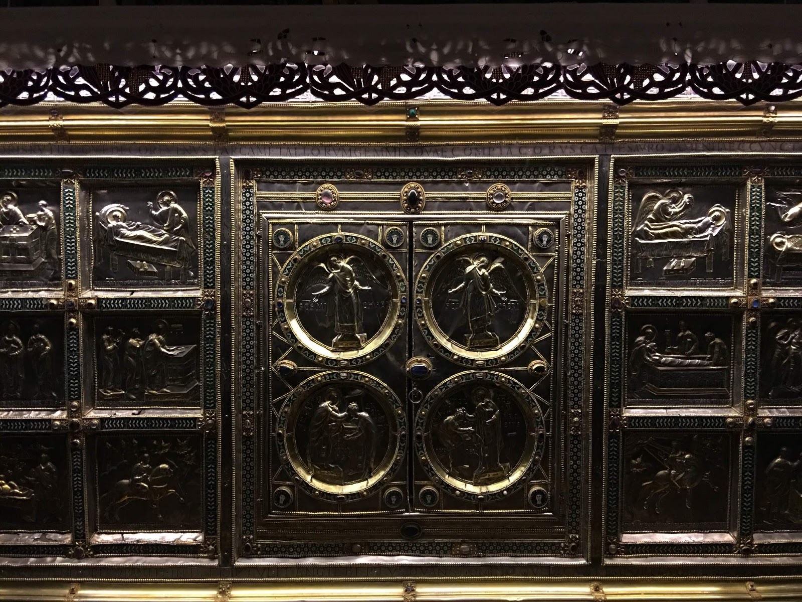 The central panel of the side facing the apse shows the Archangels Michael and Gabriel in the upper circles; in the lower ones, St Ambrose crowns the abbot of the Basilica, Angeliberto, who presents the altar to him (left), and the sculpto Vuolvino (right). Twelve episodes of the life of St Ambrose are shown to either side.