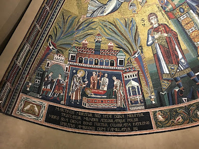 St Ambrose of Milan died on April 4, 397, which was Holy Saturday of that year. Since the date of his death very frequently occurs in either Holy Week or the Octave of Easter, his principal feast day is kept in both the Roman and Ambrosian Rites on December 7th, the day of his episcopal ordination. However, the church of Milan also traditionally keeps a commemoration of his falling asleep in the Lord, which is fixed to the Thursday within the octave of Easter.During his episcopacy, St Ambrose had discovered the relics of two Milanese martyrs, the brothers Ss Gervase and Protase, and constructed a basilica to house their remains. He himself was buried in this church; in the 9th century, his relics and those of the two martyrs were placed in a large porphyry sarcophagus in a crypt beneath the main altar. The sarcophagus itself was actually lost for a time, after sinking partly beneath the water-table, (porphyry is an incredibly heavy kind of Egyptian granite), and rediscovered only in the 1880s; another feast on the Ambrosian Calendar commemorates this rediscovery on May 14th. To mark the day, here are some recent pictures of the Basilica from our Ambrosian correspondent, Nicola de’ Grandi.The 9th century apsidal mosaic was badly damaged by a bomb during World War II, but expertly reconstructed. Christ is shown with the Archangels Michael and Gabriel and the martyrs Gervasius and Protasius to either side of His throne; below are portraits of St Ambrose’s siblings, St Marcellina and Satyrus, and St Candida.