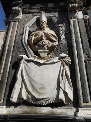 Today is the feast of St Januarius, who is also widely known by the Italian form of his name “San Gennaro”, as emigrants from Naples, of which he is the principle Patron, have brought the devotion to him wherever they have settled; the feast held in his honor in New York City is particularly famous. September 19th is the day of his martyrdom, which took place at Pozzuoli during the persecution of Diocletian, alongside several other Christians from various parts of Campania; he was in point of fact bishop of Benevento, about 33 miles to the north-east of Naples. In the Middle Ages, his relics were transferred to the important monastery of Monte Vergine, and from there to the cathedral of Naples only in the beginning of the 16th century.He is of course especially well-known for the famous miracles which takes place on his feast days in most years, when the relic of his blood is brought into the presence of the relic of his skull and liquifies. Perhaps less well-known is the fact that the miracle normally happens three times a year, since Naples celebrates two other feasts of him as well. On the Saturday before the first Sunday of May, the translation of relics is commemorated; on December 16th, a third feast commemorates a rather spectacular miracle by which St Januarius demonstrated his care for and protection of the city. In 1631, an unusually powerful lava flow from Mt Vesuvius, the central crater of which is only 9 miles from the city center, had come down towards the city and threatened to destroy the granaries which would provide bread for the populace through the upcoming winter. The bishop therefore brought the Saint’s relics to the lava flow, which turned aside at that point. I attended this December feast one year, when the relics of the blood are brought from the cathedral to the church of St Clare; I could see very clearly that the liquified blood was moving around inside the crystal vial which contains it, mounted in the reliquary, as it was carried back to the large chapel at the cathedral where it is housed.Outside the church of Santa Caterina a Formiello in Naples is a monument which commemorates another occasion on which St Januarius saved Naples and the region around it from the eruptions of Vesuvius, in 1727.“To Saint Januarius, chief patron of the city of Naples, because, when (the relic of) his sacred head was shown on an altar set up in this place, he put down and completely pacified the destructive assaults of Mt Vesuvius in the year 1727, as, with a great eruption of fire, it raged with increasing force for a great many days, and thus threatened most certainly to burn the city and all of Campania; the Neapolitans, mindful of his divine favor, as also of the countless others by which he has liberated the city and its region from war, famine, plague and earthquake, set this monument.”Behind the cathedral, in the Piazza Cardinal Sforza, stands a large baroque obelisk, also still called by the medieval Italian term “guglia”, which was erected in the Saint’s honor after the miracle of 1631. The inscription on the say that “the grateful city of Naples raised (it) to Saint Januarius, most ready protector of the nation and kingdom, and her most-well deserving citizen.”