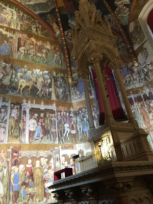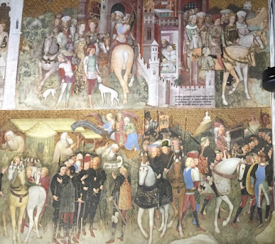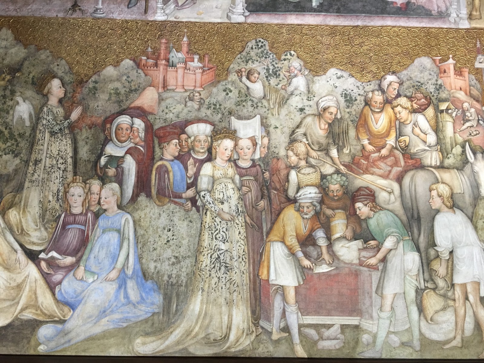 St Theodelinda’s dream, and the construction of the city of Monza and the original oratory. In the upper right, next to the stem of the Visconti family (rulers of Milan from 1277 to 1447), Agilulf abjures Arianism and converts to Catholicism; below, first Theodelinda, and then Adaloald, offer various gifts to the cathedral of Monza. (Some of the items represented in these frescoes still exist, and are preserved in the cathedral treasury, of which we will show some photos later this week.)