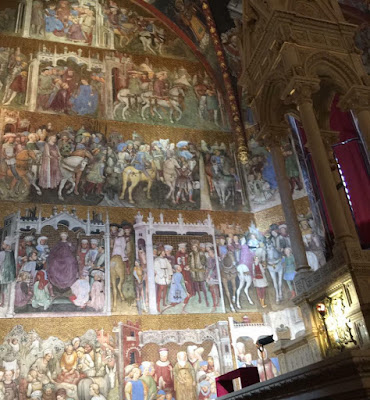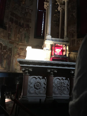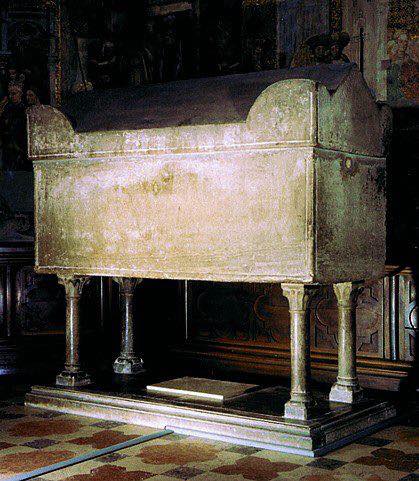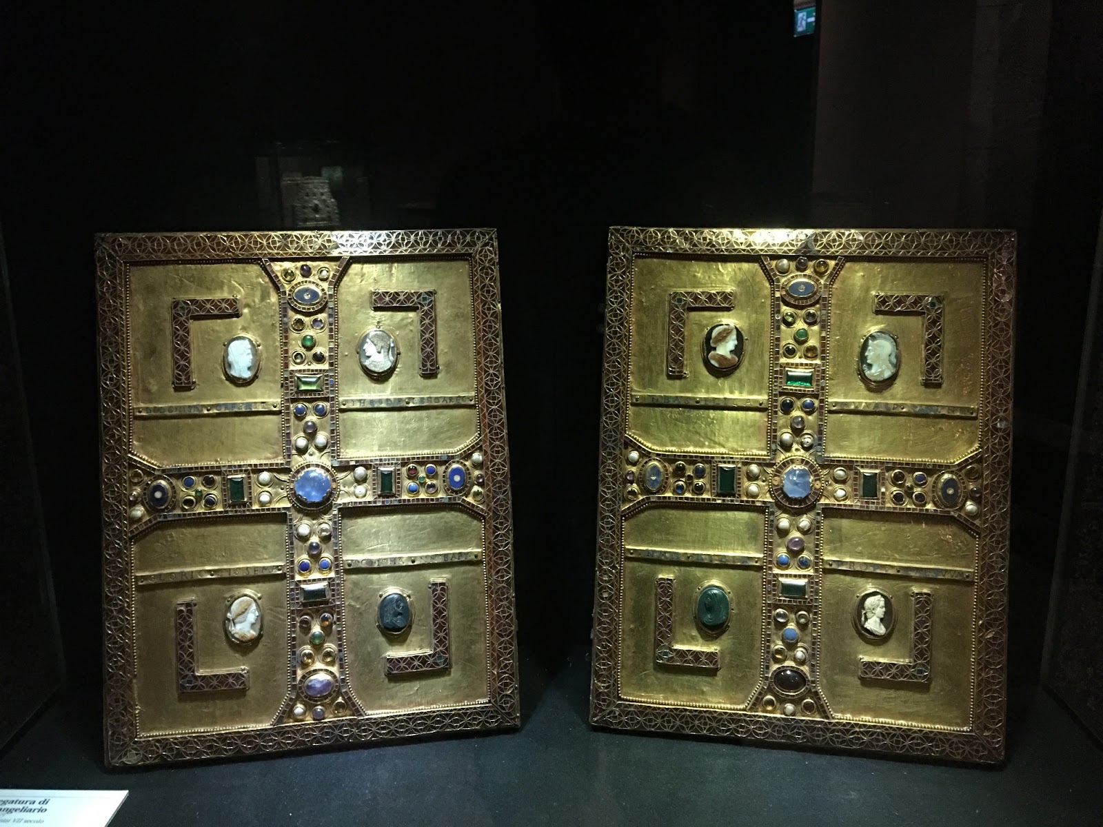 This past Sunday, January 22, was the feast of St Theodolinda, queen of the Lombards, who died in the year 627. A daughter of the duke of Bavaria, she was married in 589 to the Lombard King Authari. When he died the following year, she was allowed to choose her own second husband, who would then become the next king. Her choice fell upon Agilulf, the duke of Turin, who at her behest, moved the capital from Pavia to Milan, a move which helped to integrate the Lombards with the Roman population; henceforth, the kings of Lombardy were to be called “Kings of All Italy” instead.As a fervent Catholic, Theodolinda contributed much to the restoration of the Nicene faith among the many Arian peoples of northern Italy. On the occasion of her son Adaloald’s baptism, Pope St Gregory the Great sent her a precious Gospel book which is still preserved at Monza.The original covers of the Gospel Book of St Theodelinda.The foundation of that city, where she kept her summer residence, is traditionally attributed to her; the legend has it that while traveling there, she dreamed of a dove that said to her “modo”, i.e. “here”, to which she answered “etiam.” i.e. “yes!” This is said to be the origin of the Latin “Modœtia”, which became “Monza” in Italian. In her new city, Theodolinda also established a private oratory, dedicated to St John the Baptist, the earliest foundation of the city’s cathedral.At the death of Agilulf, she ruled for a time as her son’s regent, and in this period, received a second gift from Pope Gregory, the Iron Crown of Monza. This was said to have been made from a helmet of Constantine, and to include within itself one of the Nails of the Crucifixion, given to the latter by his mother St Helena three centuries earlier. This crown would become the symbol of the title “King of Italy.”However, at the very end of her life, her son was deposed by the dukes of Lombard dukes in favor of her son-in-law. She died a few months later, in the year 628, and was originally buried in her oratory in Monza, where she has long been popularly venerated as a Saint. The Iron Crown is preserved in a special chapel of the Cathedral of Monza, dedicated to St Theodelinda, and frescoed with the episodes of her life in the 1440s by the brothers Zavattari. (These pictures, and the text above, are by our Ambrosian correspondent Nicola de’ Grandi.)Her sepulcher