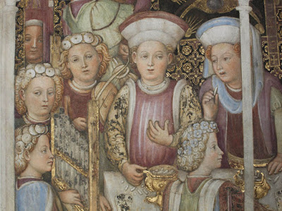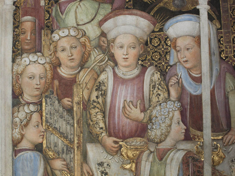 In the ceiling, three deacons are shown with their stoles above their dalmatics, in accordance with the Ambrosian custom (although Monza is not an Ambrosian city): St Vincent of Saragossa in the center in red, who shares his feast day with St Theodelinda, with Ss Stephen and Lawrence to either side of him.
