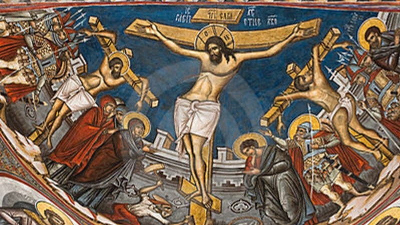 Crucifixion of Jesus icon, Moldovita Monastery, Moldavia, Romania.The First Sunday of Lent, March 13, 2011By Father Bernard BourgeoisGenesis 2:7-9, 3:1-7; Psalm 51; Romans 5:12-19; Matthew 4:1-11What are your memories of Lent? Are they of Friday fish sticks, Stations of the Cross, or purple vestments? How about the sacrament of reconciliation? Maybe any or all of these make you think of Lent and its call to holiness. And that’s what Lent really is! It is a call to holiness and a deepening of the unity between the disciple and Jesus. Ultimately the goal of any prayer or liturgical season is unity with Christ, as much as possible while here on earth, and in its fullness in eternal life. Lent is a period of retreat. In it, the faithful are called to walk the path of the suffering and death of Jesus Christ, our Lord and Savior.The second reading for this Sunday (see above) reminds the Church of the focus of Lent. Paul, in his letter to the Romans, says the following: “Through one man sin entered the world, and through sin, death, and thus death came to all men, inasmuch as all sinned…” This is a discussion on the role of Adam in the economy of salvation. Remember that both the Old and New Testaments begin with trees. There is the tree in the center of Paradise from which Adam and Eve ate the fruit forbidden by God. In the New Testament, there is the tree of the cross on which Jesus was hanged. Paul, in Romans, continues: “In conclusion, just as through one transgression condemnation came upon all, so, through one righteous act, acquittal and life came to all.” Adam’s sin (from the tree in the center of Paradise) brought condemnation and death. Jesus’ act of dying on the cross forgave Adam’s sin and brought forgiveness and life to all. In Lent, the faithful Christian seeks forgiveness for the sins of his or her life that come through the tree of Adam. Through works of prayer, fasting, and almsgiving, the person makes a concerted effort to surface that which in his life is sinful.The path to forgiveness and life in Christ is to carry one’s cross with him over Golgotha. Lent helps the mature Christian realize that without the cross, there is no hope. Sinfulness is much like an addiction, and anyone who has overcome addictions knows the first step toward healing is to admit the problem exists. So it goes with sinfulness. The only way for the person to overcome sinfulness is to realize its power over the person and then to embrace the cross.Why would anyone embrace the cross? What good will that do? Embracing the cross is not a magic wand that will get waved over one’s head and all sinfulness is gone. If it were only that easy! No, the reason to embrace the cross is to see the resurrection. Yes, the cross is not the final chapter of the story! The resurrection of Jesus, celebrated on Easter, is the ending of the story. The death and resurrection of Jesus form a single event, which became the most important event in all of human history. As sinners, Christians embrace the cross in order to die with Christ, and then rise with him. Christians are now people of hope. They realize that there will be a time when all sin has come to an end, and there will be only a life of peace, joy, and eternal happiness with God. Christ and his cross are our only hope! It is through the death and resurrection of Jesus that forgiveness is possible. That’s how much God loves us!Walking the path of the cross is the work of Lent. Traditionally the faithful do that in three ways: prayer, fasting, and almsgiving. Lent is an intense period of prayer in which each person is called to find ever new ways of prayer. Spend some extra time in Church. Participate in daily Mass and the Stations of the Cross. Read the Scriptures or find some other way to pray more deeply. Each person is called to fast in some way. Put away something that distracts you from Christ. Sacrificing is a great way to see that all one needs is Christ. Finally, find ways of being generous with your time, talent, and treasure. Yes, give until it hurts, as the cliché reminds us. Again, you will see that giving helps you understand the need of Christ in your life. This is the journey of Lent. Pray that when you wake up Easter Sunday morning, you are a person who has embraced the cross of Christ to be a person of hope!