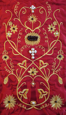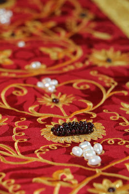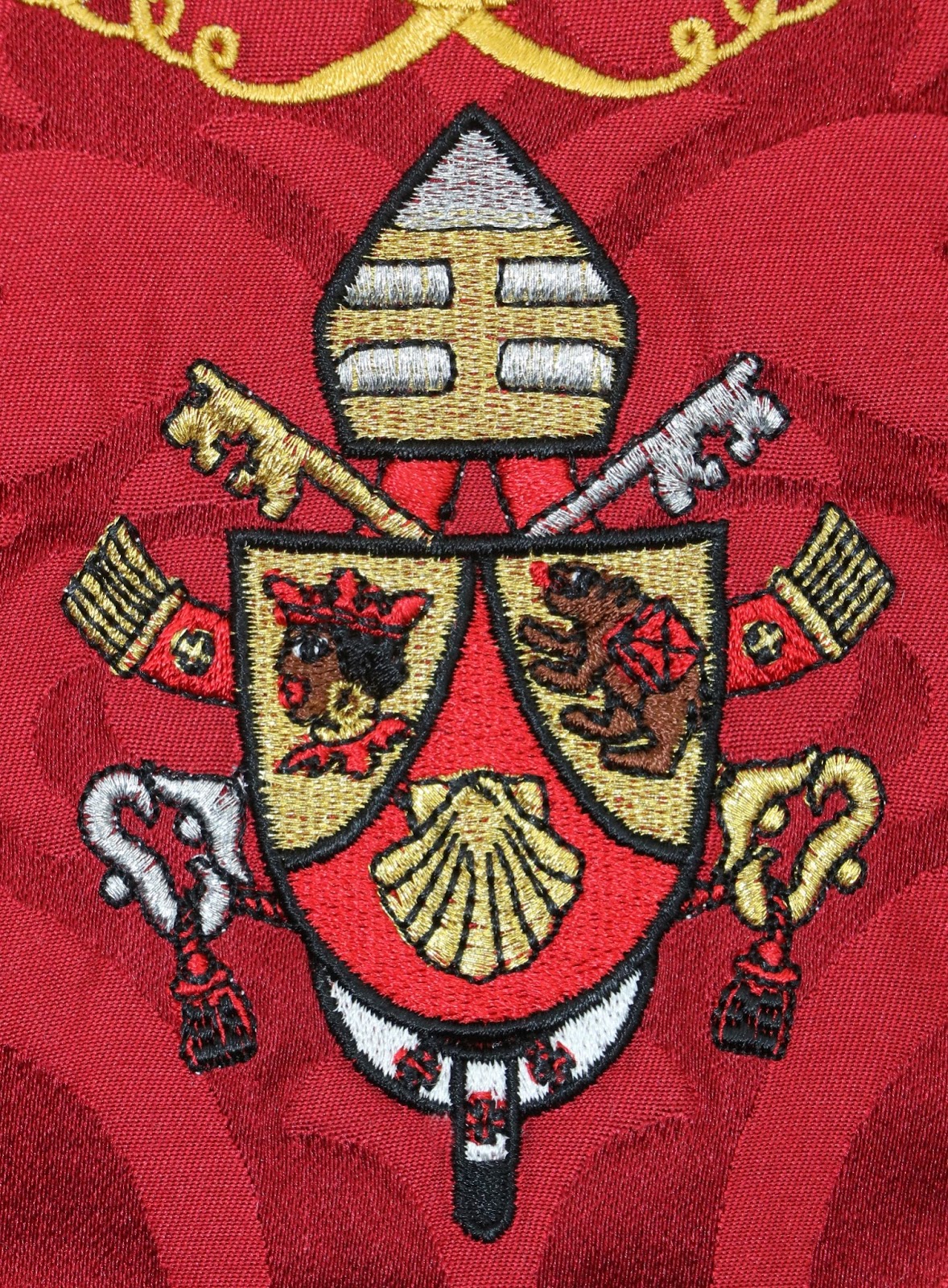 Our Lady of AltöttingI managed to incorporate these into my own design, which was then embellished with fresh water pearls and garnet. At the base of the back of the chasuble I embroidered his Papal coat of arms.
