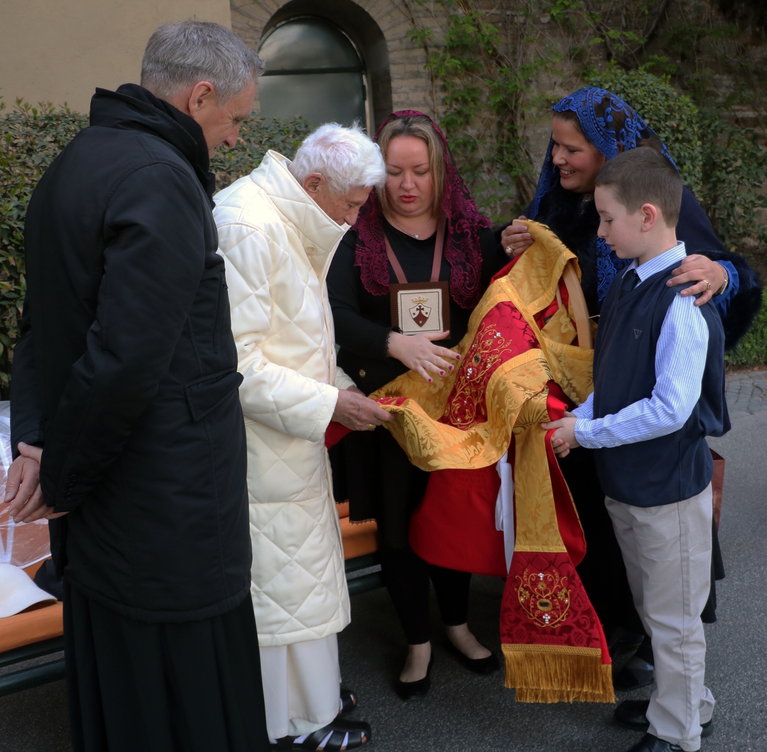 We are very grateful indeed to Mrs Clare Short of DiClara Vestments for sharing with NLM this account of her recent meeting with Pope Emeritus Benedict XVI; on this occasion, she presented him with a new set of vestments as a present for his 90th birthday, which he celebrated on Easter Sunday, April 16th.