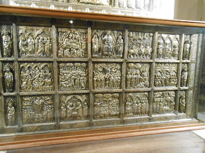 All Catholics know that the church of Santiago di Compostella in Spain is one of the most important pilgrimage shrines in the world. Far less well known today is the fact that the Tuscan city of Pistoia was once another major locus of pilgrimage in honor of the St James the Great. Since the middle of the 12th century, the cathedral of St Zeno has possessed a relic of the Apostle, a small piece of his skull acquired by Bishop Atto in 1145. Last November, I took a nighttime tour of the cathedral, during which the archpriest, Don Luca Carlesi, gave an extremely interesting presentation on its history. During the Middle Ages, the relic was a major draw for pilgrims who could not travel all the distance to Compostella. Large crowds of pilgrims were often a source of great prosperity to medieval cities, and, as Don Luca phrased it to a mostly local group of visitors, “Everything that our ancestors were able to make of the city of Pistoia in the High Middle Ages is due to the presence of this relic.”The reliquary of St James the Apostle, made in the 15th century; it also contains relics of Maria Salome, traditionally identified as his mother, St Martin of Tour, and two local early martyrs, priests named Rufinus and Felix.The relic was formerly kept in a special chapel gated off from the rest of the church at the back of the right nave; this chapel was the property of the city, and under its jurisdiction, not of the cathedral and its bishop and canons. The city’s governing council held its meetings in it, as a sign of the Apostle’s protection and patronage, and its constitution was kept in the small safe-room which also stored its precious objects.Between 1287 and 1456, the chapel’s altar was commissioned in different stages. The various parts of it have been dismantled, reassembled and reordered on several occasions; during the Second World War, it was taken apart and removed to a deposit for safe-keeping. and afterwards reassembled. The current arrangement dates from the year 1953. Since the panels are made of silver, it is now kept behind rather thick glass to prevent people from touching them, which makes a certain amount of lens flare unavoidable.