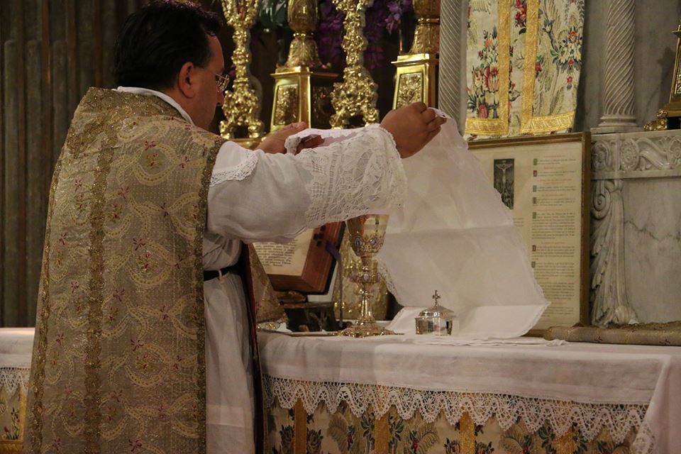 After the Consecration of the chalice, the corporal, which is very much longer than a modern Roman one, is used to cover the consecrated elements.