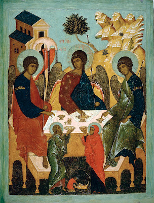 In this we see a depiction of the sacrifice again, but also the scene known as the Hospitality of Abraham, Genesis 18, 1-15, in which he welcomes three strangers. They are three angels under the appearance of men, traditionally seen as symbols of the three persons of the Trinity. This second theme is also the subject of many famous paintings. After an Eastern iconographic depiction, which will be familiar to many through that of Andrei Rublev, I give two Western images. The first is 16th century Italian, the second 15th century Flemish.