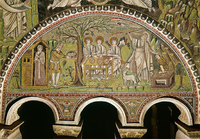 This is not the only daily liturgical reference to Abraham. He is referred to in the Gospel canticles sung daily at Lauds and Vespers, the Benedictus and the Magnificat, and in both of them he is called “Father.” There could be a incensing of his image during either of these on certain days.The place of the Patriarchs of the Old Testament in salvation history is, as I understand it, that of establishing the practises of faith. In this sense, Abraham clearly has a place in the establishment of liturgical tradition through his being prepared to sacrifice his only son, and ultimately sacrificing a ram.Here is an image which might be appropriate behind the altar in a church, a 6th century mosaic from Ravenna in Italy.