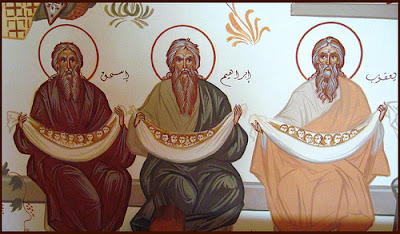 Yesterday, October 9th, was the feast day of the Patriarch St Abraham, who is called by the Martyrology “The Father of All Believers.”It is common for the Saints of the Old Testament to be commemorated in the Divine Liturgy of the Eastern churches, and the Patriarchs and Prophets are commonly patrons of churches, and referred to as Saints. Here is a fresco in which three patriarchs Ss Abraham, Isaac and Jacob appear. These might be life-size on the wall of the church, so that one would get the impression that these figures are praying the liturgy with us.